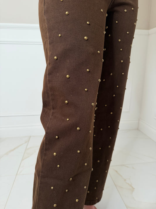 High waisted gold detail brown jeans